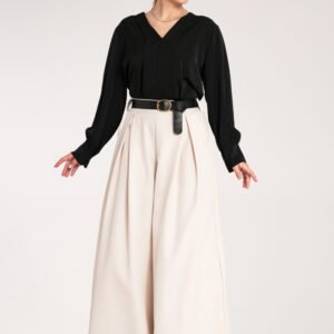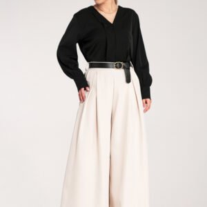 Spodnie typu palazzo z czarnym paskiem z klamrą. Wykonane z delikatnej tkaniny. Spodnie z wysokim stanem. Elastyczne w pasie z szeroką nogawką. Po bokach kieszenie wsuwane.