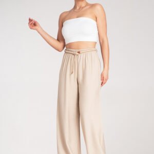 Spodnie boho z elastycznym pasem i dekoracyjnym plecionym paskiem w naturalnym odcieniu. Wykonane z lekkiego, przewiewnego materiału. W pasie guma.