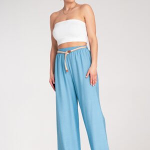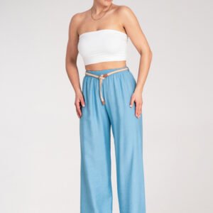 Spodnie boho z elastycznym pasem i dekoracyjnym plecionym paskiem w naturalnym odcieniu. Wykonane z lekkiego, przewiewnego materiału. W pasie guma.