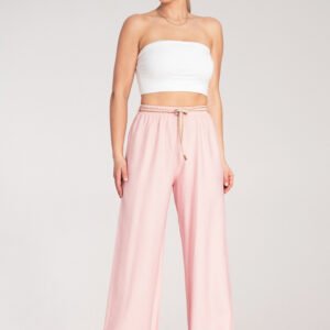 Spodnie boho z elastycznym pasem i dekoracyjnym plecionym paskiem w naturalnym odcieniu. Wykonane z lekkiego, przewiewnego materiału. W pasie guma.
