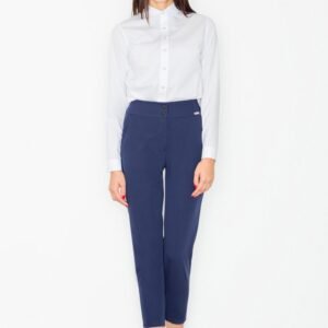 Spodnie damskie z podwyższonym stanem, o długości 7/8. Zapinane na zamek i guziki. Po bokach kieszenie wsuwane. Idealne na wiele okazji.