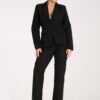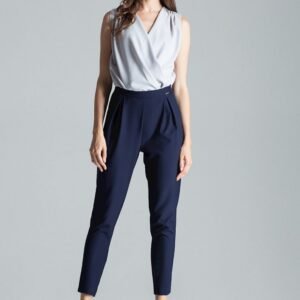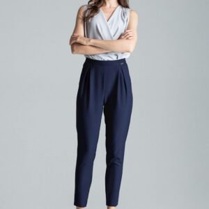 Granatowe klasyczne spodnie z zakładkami w pasie, skośne kieszenie z boku.Spodnie zapinane na zamek z lewej strony. Nogawki lekko zwężane do dołu.