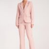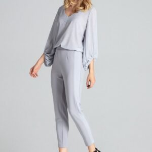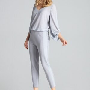 Szare kobiece spodnie z brokatowymi lampasami, nogawki lekko zwężane. Z tyłu w pasie wszyta szeroka guma, bez kieszeni.