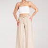 Beżowe sztruksowe spodnie z zakładkami w pasie, zapinane na guzik i kryty zamek. Kieszenie w bocznych szwach. Nogawki zwężane do dołu.