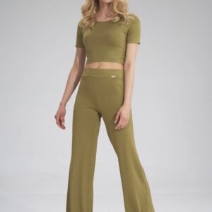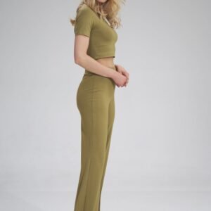 Długie spodnie dzwony, szeroka guma w pasie, bez kieszeni, oraz bez zamka.