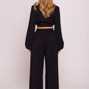 Stylowe i wygodne spodnie uszyte z lekkiej tkaniny o wyraźnej strukturze krepa z matowym wykończeniem. Model o luźnym fasonie i szerokich, długich nogawkach zapewnia swobodę ruchów i nowoczesny wygląd, idealny zarówno na co dzień, jak i do bardziej eleganckich stylizacji. Wysoki, elastyczny pas sprawia, że spodnie świetnie dopasowują się do sylwetki i są łatwe do założenia bez zamka, bez guzików. Brak kieszeni podkreśla prostotę i lekkość formy. Zaprojektowano i uszyto w Polsce, z myślą o komforcie i ponadczasowym stylu.