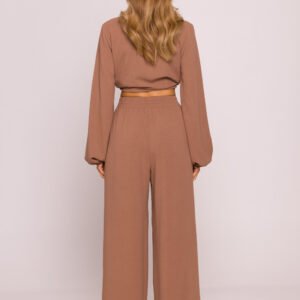 Stylowe i wygodne spodnie uszyte z lekkiej tkaniny o wyraźnej strukturze krepa z matowym wykończeniem. Model o luźnym fasonie i szerokich, długich nogawkach zapewnia swobodę ruchów i nowoczesny wygląd, idealny zarówno na co dzień, jak i do bardziej eleganckich stylizacji. Wysoki, elastyczny pas sprawia, że spodnie świetnie dopasowują się do sylwetki i są łatwe do założenia bez zamka, bez guzików. Brak kieszeni podkreśla prostotę i lekkość formy. Zaprojektowano i uszyto w Polsce, z myślą o komforcie i ponadczasowym stylu.