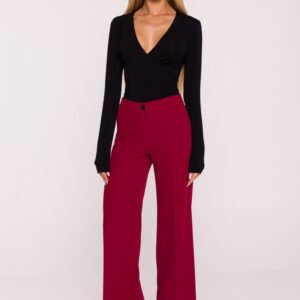 Klasyczne spodnie damskie uszyte z gładkiej tkaniny garniturowej o matowym wykończeniu to elegancka i ponadczasowa propozycja do wielu stylizacji. Materiał zachowuje strukturę, a zaprasowane na kant nogawki dodają całości wyrafinowanego charakteru. Model o średnim stanie dopasowuje się w talii i biodrach, a szeroka nogawka od uda w dół zapewnia komfort noszenia i swobodę ruchu. Zapięcie na guzik i kryty zamek z przodu gwarantuje wygodę, a boczne kieszenie dodają funkcjonalności. Spodnie sięgają do ziemi, co w połączeniu z szeroką nogawką optycznie wydłuża sylwetkę i podkreśla elegancki charakter całej stylizacji. Brak podszewki sprawia, że model pozostaje lekki i komfortowy w noszeniu. Zaprojektowane i uszyte w Polsce, dla kobiet, które cenią klasykę, wygodę i doskonałe wykonanie.