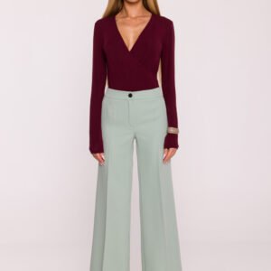 Klasyczne spodnie damskie uszyte z gładkiej tkaniny garniturowej o matowym wykończeniu to elegancka i ponadczasowa propozycja do wielu stylizacji. Materiał zachowuje strukturę, a zaprasowane na kant nogawki dodają całości wyrafinowanego charakteru. Model o średnim stanie dopasowuje się w talii i biodrach, a szeroka nogawka od uda w dół zapewnia komfort noszenia i swobodę ruchu. Zapięcie na guzik i kryty zamek z przodu gwarantuje wygodę, a boczne kieszenie dodają funkcjonalności. Spodnie sięgają do ziemi, co w połączeniu z szeroką nogawką optycznie wydłuża sylwetkę i podkreśla elegancki charakter całej stylizacji. Brak podszewki sprawia, że model pozostaje lekki i komfortowy w noszeniu. Zaprojektowane i uszyte w Polsce, dla kobiet, które cenią klasykę, wygodę i doskonałe wykonanie.