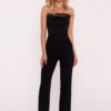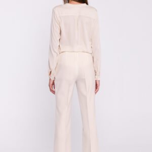 Eleganckie damskie spodnie z tkaniny, wyróżniające się rozszerzanymi nogawkami u dołu, które dodają sylwetce lekkości i wydłużają nogi. Zaprasowanie na kant podkreśla ich klasyczny i wyrafinowany charakter, idealny zarówno do pracy, jak i na formalne okazje. Spodnie mają wysoki stan, który pięknie podkreśla talię, a kryty zamek z tyłu zapewnia gładkie, dyskretne zapięcie. Zaprojektowane i uszyte w Polsce, łączą w sobie doskonałe wykonanie z modnym, kobiecym fasonem.
