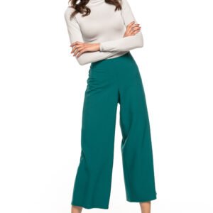 Spodnie o wysokim stanie z szeroką nogawką. Dla uzyskania lepszej formy zarówno z przodu jak i z tyłu szyjemy zaszewki modelujące, dzięki temu spodnie pięknie układają się w obrębie pasa. Z boku wszywamy zamek ozdobny. Szeroka nogawka jest naszym ukłonem w stronę lat 70-tych, chociaż skracając je do długości 7/8 uzyskujemy bardziej nowoczesny look. Spodnie idealnie nadają się zarówno do eleganckich stylizacji jak i do tych bardziej swobodnych.