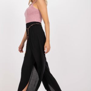 Zwiewne spodnie damskie z wysokim stanem oraz ozdobnym wiązaniem w pasie.
