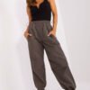 Zwiewne spodnie damskie z wysokim stanem oraz ozdobnym wiązaniem w pasie.