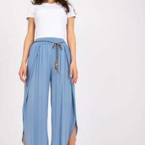 Zwiewne spodnie damskie z wysokim stanem oraz ozdobnym wiązaniem w pasie.