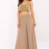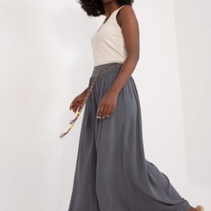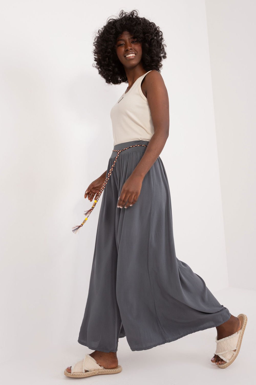 Wiskozowe spodnie z wysokim stanem, gumka w pasie. Spodnie z szerokimi nogawkami, ozdobny pasek do wiązania.
