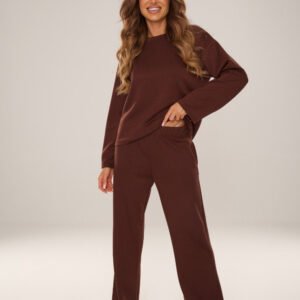 Komplet damski homewear w kolorze czekoladowym to harmonijne połączenie wygody i subtelnej elegancji. Stworzony z myślą o relaksie w domowym zaciszu, zapewnia maksymalny komfort noszenia oraz przyjemne otulenie przez cały dzień. Uszyty z wyjątkowo miękkiej dzianiny typu masełko, wyróżnia się idealnie gładką strukturą i delikatnym, szlachetnym połyskiem, który nadaje codziennym stylizacjom nutę luksusu. Bluza o luźnym kroju z długim rękawem i półokrągłym dekoltem. Długie spodnie wyposażone w praktyczne kieszenie, elastyczna guma w pasie umieszczona w tunelu dla idealnego dopasowania. Doskonały wybór do odpoczynku w domu, na spacery oraz do casualowych stylizacji. Ten komplet to esencja komfortowego homewearu miękki, stylowy i niezwykle wygodny, tak że z przyjemnością będziesz nosić go przez cały dzień.