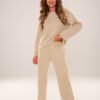 Komplet damski homewear w kolorze mocca to harmonijne połączenie wygody i subtelnej elegancji. Stworzony z myślą o relaksie w domowym zaciszu, zapewnia maksymalny komfort noszenia oraz przyjemne otulenie przez cały dzień. Uszyty z wyjątkowo miękkiej dzianiny typu masełko, wyróżnia się idealnie gładką strukturą i delikatnym, szlachetnym połyskiem, który nadaje codziennym stylizacjom nutę luksusu. Bluza o luźnym kroju z długim rękawem i półokrągłym dekoltem. Długie spodnie wyposażone w praktyczne kieszenie, elastyczna guma w pasie umieszczona w tunelu dla idealnego dopasowania. Doskonały wybór do odpoczynku w domu, na spacery oraz do casualowych stylizacji. Ten komplet to esencja komfortowego homewearu miękki, stylowy i niezwykle wygodny, tak że z przyjemnością będziesz nosić go przez cały dzień.