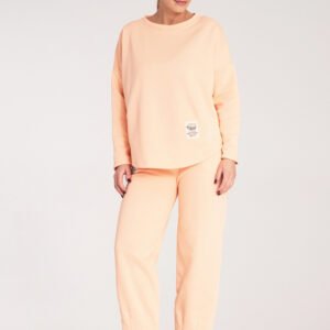 Komplet dresowy. Luźna bluza z długimi rękawami i okrągłym dekoltem oraz spodnie z gumką w pasie, wiązane troczkiem.