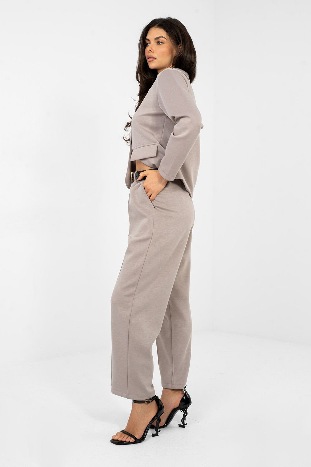 Nowoczesne spodnie dresowe o eleganckim charakterze, które doskonale sprawdzą się zarówno na co dzień, do pracy, jak i na wizytowe okazje. To idealne połączenie wygody i szyku w nowoczesnym stylu. Wykonane z wysokiej jakości wiskozy z dodatkiem elastanu, zapewniają komfort noszenia, miękkość oraz swobodę ruchów. Gładki wzór i dopracowany krój nadają im eleganckiego wyglądu. Model z wysokim stanem oraz zwężanymi nogawkami, które zostały przeszyte w kant, optycznie wydłużają nogi i podkreślają sylwetkę. Brak klasycznego zapięcia zwiększa wygodę użytkowania, a wsuwane kieszenie dodają funkcjonalności. Dodatkowym atutem jest pasek z możliwością zapięcia, który podkreśla talię i nadaje spodniom bardziej eleganckiego charakteru. To idealny wybór dla kobiet, które cenią wygodę dresów połączoną z eleganckim stylem.