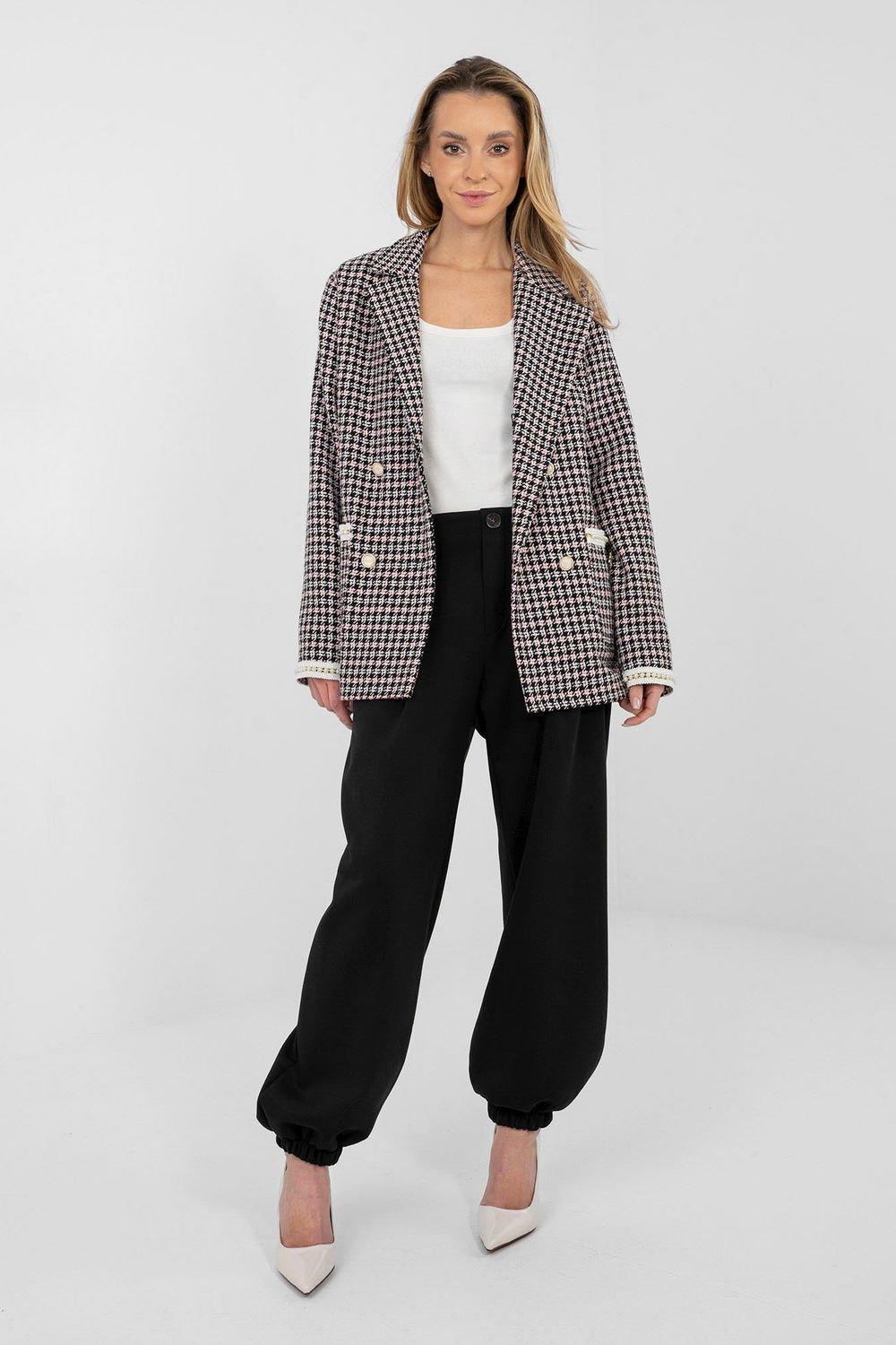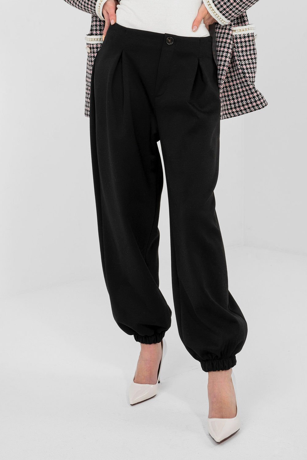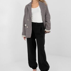 Casualowe spodnie dresowe typu joggery to połączenie wygody i stylowego wyglądu, idealne na co dzień oraz do pracy w luźniejszym stylu. Wykonane z miękkiej i elastycznej mieszanki wiskozy z dodatkiem elastanu, zapewniają komfort noszenia oraz swobodę ruchów. Model o gładkim wzorze, z ozdobnymi zakładkami na przodzie, które nadają spodniom eleganckiego charakteru. Z tyłu wszyta elastyczna guma gwarantuje dobre dopasowanie do sylwetki. Nogawki zakończone ściągaczami podkreślają fason joggerów i zapewniają wygodę użytkowania. Spodnie nie posiadają zapięcia, a boczne kieszenie wsuwane zwiększają ich funkcjonalność. Całość uzupełnia ozdobny guzik, stanowiący stylowy detal. Idealne do codziennych stylizacji z bluzą, swetrem lub koszulą.