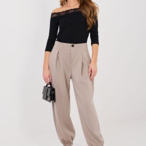 Casualowe spodnie dresowe typu joggery to połączenie wygody i stylowego wyglądu, idealne na co dzień oraz do pracy w luźniejszym stylu. Wykonane z miękkiej i elastycznej mieszanki wiskozy z dodatkiem elastanu, zapewniają komfort noszenia oraz swobodę ruchów. Model o gładkim wzorze, z ozdobnymi zakładkami na przodzie, które nadają spodniom eleganckiego charakteru. Z tyłu wszyta elastyczna guma gwarantuje dobre dopasowanie do sylwetki. Nogawki zakończone ściągaczami podkreślają fason joggerów i zapewniają wygodę użytkowania. Spodnie nie posiadają zapięcia, a boczne kieszenie wsuwane zwiększają ich funkcjonalność. Całość uzupełnia ozdobny guzik, stanowiący stylowy detal. Idealne do codziennych stylizacji z bluzą, swetrem lub koszulą.