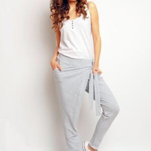 Niecodzienne spodnie dresowe pumpy o luźnym kroju. Z boku fragment materiału wiązany na supełek. Nogawki zwężane na dole, ozdobione mankietami. Kieszenie po bokach. Spodnie wykonane z wysokiej jakości bawełny, zapewniającej najwyższy komfort noszenia. Na pewno dodadzą każdej sportowej stylizacji oryginalnego charakteru. Model idealny na chłodniejsze wiosenne i letnie dni.