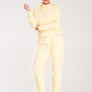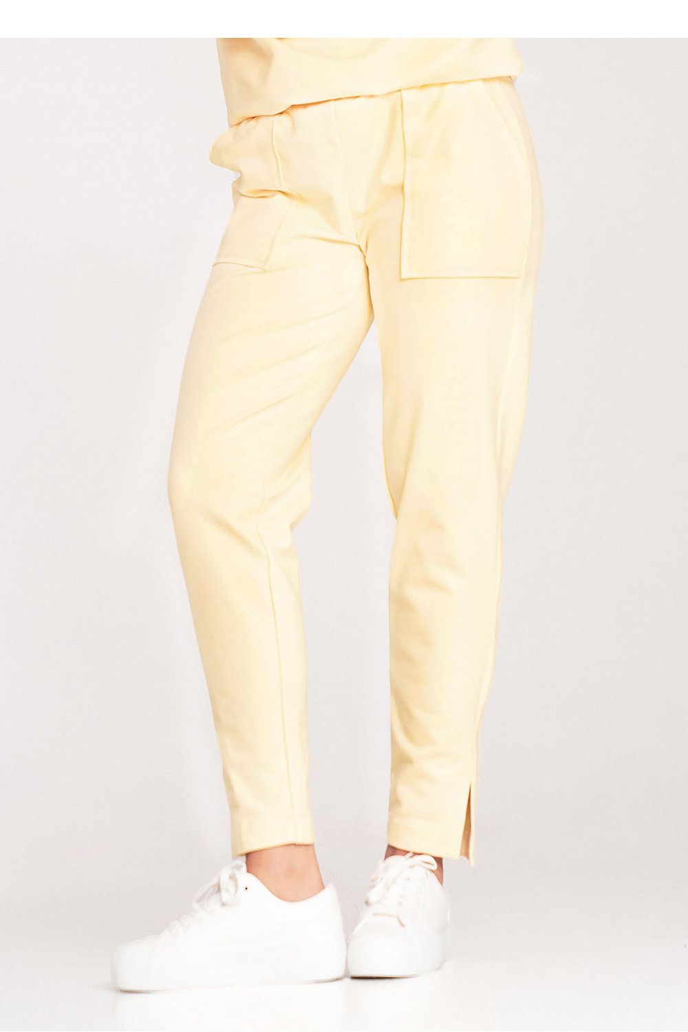 Bawełniane sportowe spodnie. W pasie wszyta szeroka, marszczona guma. Nogawki zwężane do dołu, na dole rozcięcie. Z przodu duże, naszywane kieszenie.