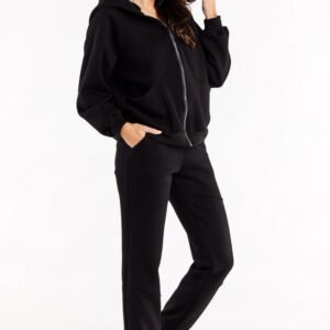 Luźne spodnie dresowe z ozdobnymi szwami na przodzie nogawek, w pasie wszyta guma. Po bokach kieszenie wsuwane. Nogawki wykończone ściągaczami.