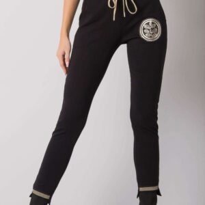 Czarne spodnie dresowe damskie z nadrukiem. W pasie guma oraz sznurek do wiązania.