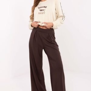 Stylowe spodnie dresowe typu palazzo, łączące wygodę i elegancję w codziennych stylizacjach. Wykonane z miękkiej mieszanki wiskozy, poliestru i elastanu, zapewniają komfort noszenia oraz swobodę ruchów. Gładki materiał i szerokie nogawki nadają im modny, lekko oversizeowy charakter. Wysoki pas z elastyczną gumą gwarantuje idealne dopasowanie do sylwetki, a ozdobne zakładki na przodzie dodają im wyjątkowego wyrazu. Model bez zapięcia, wyposażony w praktyczne boczne kieszenie. Doskonałe na co dzień, zarówno do sportowych, jak i bardziej eleganckich zestawień.