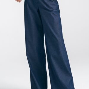 Po wielu sezonach dominacji wąskich spodni, powróciły modele z szerokimi nogawkami, tak zwane wide leg. Spodnie tego typu tworzą zgrany duet wraz z oversizowa marynarką w tym samym kolorze lub wzorze. Posiadają lekko podwyższony stan, dzięki czemu wydłużają optycznie sylwetkę. Na przodzie ozdobne zakładki. Spodnie zapinane na zamek i guzik. Klasyczne kieszenie wsuwane.