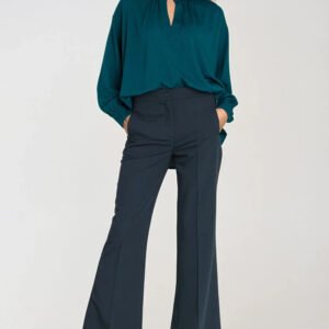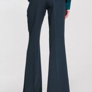 Stylowe spodnie damskie o dopasowanym kroju (fit) i średnim stanie, które podkreślają sylwetkę, zachowując elegancki charakter. Model z nogawką mocno rozszerzającą się od kolana ku dołowi, co optycznie wydłuża nogi i nadaje całości modny, kobiecy wygląd. Z przodu i z tyłu znajdują się zaprasowane kanty, dodające spodniom szyku i profesjonalnego wyrazu. Spodnie posiadają zapięcie na suwak i guzik oraz klasyczne kieszenie z przodu. Uniwersalny model, który doskonale sprawdzi się zarówno w stylizacjach biurowych, jak i eleganckich zestawach na co dzień.
