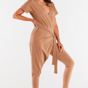 Kombinezon z obcisłymi nogawkami oraz kopertową górą. Marszczony szeroką gumką w pasie. Posiada asymetryczne wiązanie z przodu oraz kieszenie. Zaprojektowano i uszyto w Polsce.