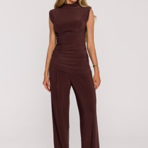 Nowoczesny i elegancki komplet damski uszyty z gładkiej dzianiny, która jest miękka, elastyczna i wyjątkowo wygodna w noszeniu. To połączenie komfortu z wyrafinowanym stylem, idealne zarówno na co dzień, jak i na specjalne okazje. Bluzka bez rękawów zachwyca dopasowanym krojem, półgolfem oraz subtelnym drapowaniem, które podkreśla sylwetkę i dodaje jej lekkości. Asymetryczne wykończenie u dołu wprowadza nowoczesny akcent i optycznie wysmukla figurę. Spodnie o luźnym kroju mają szerokie nogawki i zakładki przy pasku, dzięki czemu pięknie układają się na sylwetce, zapewniając pełną swobodę ruchu. Boczne kieszenie dodają funkcjonalności, a kryty zamek z tyłu gwarantuje estetyczne wykończenie. Komplet nie posiada podszewki, co czyni go lekkim i przewiewnym. Całość zaprojektowano i uszyto w Polsce z dbałością o każdy detal. Ten dwuczęściowy zestaw to doskonały wybór dla kobiet, które cenią wygodę, elegancję i nowoczesny minimalizm.