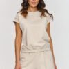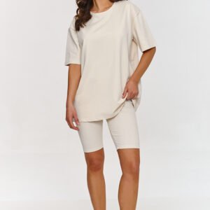 Klasyka w najlepszym wydaniu! Ten dwuczęściowy komplet łączy luźny t-shirt z dopasowanymi kolarkami, tworząc minimalistyczny i stylowy zestaw. Kolarki wykonane z prążkowanego materiału to must-have na lato. Doskonale dopasowują się do sylwetki, podkreślając kształty, ale jednocześnie gwarantując wygodę dzięki elastycznemu materiałowi. Długość kolarek sprawia, że są one wygodne i świetnie komponują się z luźniejszymi t-shirtami lub topami. T-shirt w tym komplecie ma oversizowy krój, który zapewnia pełną swobodę ruchów. Krótki rękaw i okrągły dekolt nadają mu klasyczny, uniwersalny wygląd. Komplet wykonany jest z bawełny z dodatkiem elastanu dzięki czemu jest plastyczny i idealnie dopasowuje się do ciała, gwarantując swobodę i komfort. Jego wszechstronność sprawia, że jest idealny na co dzień, do odpoczynku w domu, aktywności fizycznej jak i na wyjście na miasto czy spotkania ze znajomymi. Możesz nosić cały komplet bawełniany razem lub łączyć poszczególne elementy z innymi ubraniami. T-shirt świetnie sprawdzi się do jeansów lub legginsów, a kolarki z crop topem stworzą sportowy look.