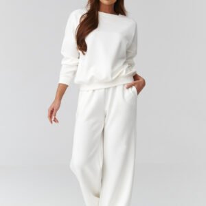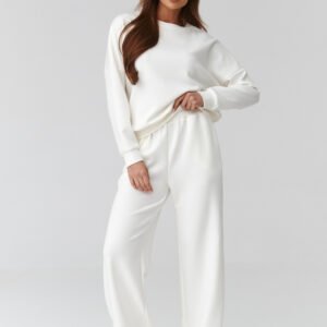 Stylowy i wygodny komplet damski one size, który idealnie sprawdzi się na co dzień, do pracy zdalnej, na spacer czy wyjazd. Zestaw składa się z luźnej bluzy z długim rękawem oraz spodni z szeroką nogawką, które zapewniają maksymalny komfort i modny wygląd. Komplet wykonany jest z miękkiego, przyjemnego w dotyku materiału, który dobrze układa się na sylwetce i nie krępuje ruchów. Uniwersalny fason dopasowuje się do różnych typów figury. Dostępne kolory dodają świeżości i świetnie wpisuje się w aktualne trendy. Wyprodukowano we Włoszech.