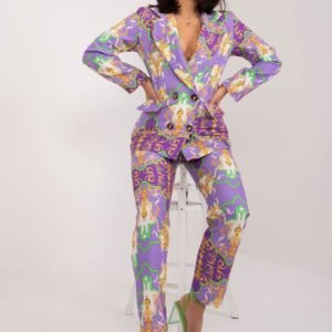 Ten elegancki komplet damski jest idealny na różne okazje, od codziennego noszenia w pracy po udział w imprezie czy spotkanie biznesowe. Składa się z marynarki z długim rękawem i spodni długich, zapinanych na zamek oraz guzik. Marynarka jest wykonana z wysokiej jakości materiału, który gwarantuje elegancję i komfort noszenia. Zapinana jest na guziki, a klapy dodają jej klasycznego charakteru. Marynarka z podszewką zapewnia wygodę i lepsze dopasowanie. Spodnie posiadają proste nogawki oraz wysoki pas, co sprawia, że są one nie tylko stylowe, ale także wygodne i dobrze dopasowane do sylwetki. Zapinane na zamek i guzik gwarantują łatwe zakładanie oraz trwałość. Komplet ten ozdobiony jest nadrukiem, który dodaje mu oryginalności i charakteru. Dzięki standardowej długości i prostym nogawkom można go łatwo zestawić z różnymi elementami garderoby, tworząc różnorodne stylizacje. Dodatkowym atutem są wsuwane kieszenie boczne w spodniach, które są praktyczne i dodają użytkowego charakteru temu zestawowi. Dzięki wysokiej jakości wykonania i eleganckiemu designowi, ten komplet damski z pewnością będzie doskonałym wyborem na wiele różnych okazji.