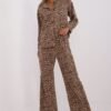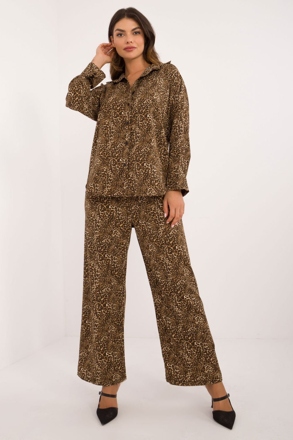 Damski komplet o modnym zwierzęcym motywie, składający się z koszuli i spodni, wykonany z połączenia poliestru i elastanu. Koszula ma długi rękaw i jest zapinana na guziki, co nadaje jej klasycznego charakteru. Dodatkowo wyposażona jest w kołnierzyk, który podkreśla elegancki wygląd. Spodnie są długie, z szerokimi nogawkami, które zapewniają wygodę i swobodę ruchów. Wysoki stan spodni pięknie podkreśla sylwetkę, dodając całości wyrafinowania. Ten komplet to idealny wybór dla kobiet ceniących modę, komfort i odrobinę drapieżnego stylu na co dzień.