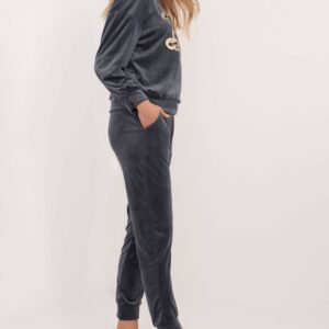 Welurowy komplet damski, składający się z bluzy i spodni, idealny na codzienne okazje, w tym do pracy, w casualowym stylu. Wykonany z miękkiej mieszanki wiskozy i elastanu, zapewnia komfort noszenia oraz swobodę ruchów. Bluza z nadrukiem na przodzie dodaje nowoczesnego, modnego akcentu, a okrągły dekolt i długi rękaw podkreślają klasyczny, wygodny fason. Spodnie mają wysoki stan, który podkreśla sylwetkę, oraz długie nogawki zakończone ściągaczami, co nadaje całości sportowego charakteru. Wsuwane boczne kieszenie to praktyczny dodatek, idealny na codzienne drobiazgi. Ten welurowy komplet to doskonałe połączenie stylu i wygody, które świetnie sprawdzi się zarówno na co dzień, jak i w bardziej casualowych sytuacjach.