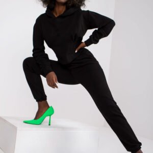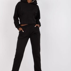 Komplet dresowy składający się z bluzy oraz długich spodni. Bluza z długim rękawem, na przodzie przeszycia, wstawka gorsetowa. Bluza z kapturem, na boku zamek. Spodnie dresowe z gumą w pasie, po bokach kieszenie wsuwane.