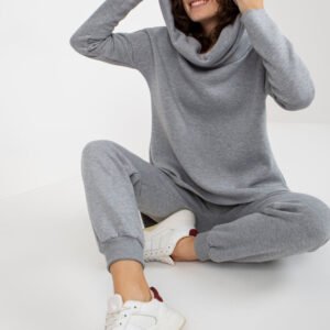 Komplet damski składający się z bluzy oraz spodni. Bluza o przedłużonym kroju z długim rękawem oraz kapturem. Długie spodnie z wiązaniem w pasie oraz kieszeniami.