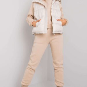 Komplet składający się z bluzy, spodni dresowych i puchowej kamizelki. Kamizelka zapinana na zamek z kieszeniami. Bluza o prostym kroju z długim rękawem i kapturem. Spodnie dresowe z kieszeniami i wiązaniem w pasie.