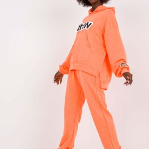 Komplet dresowy damski składający się z bluzy i spodni. Bluza z długim rękawem, kapturem oraz kieszonką na przodzie typu kangurek. Długie spodnie z gumką w pasie oraz kieszeniami wsuwanymi.