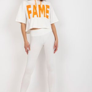 Komplet dresowy składający się z bluzy oraz legginsów. Bluza o luźnym kroju z krótkim rękawkiem oraz kapturem. Długie legginsy z szeroka gumą w pasie. Komplet z ozdobnymi napisami.