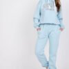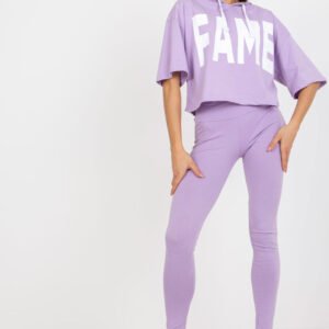 Komplet dresowy składający się z bluzy oraz legginsów. Bluza o luźnym kroju z krótkim rękawkiem oraz kapturem. Długie legginsy z szeroka gumą w pasie. Komplet z ozdobnymi napisami.
