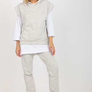 Komplet dresowy składający się z bluzki, bluzy oraz spodni. Bluzka z rękawem 3/4 oraz okrągłym dekoltem. Bluza z krótkim rękawem oraz kapturem. Długie spodnie z wiązaniem w pasie oraz kieszeniami wsuwanymi.