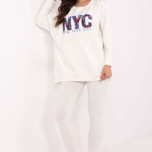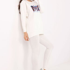 Komplet damski składający się z bluzy oraz legginsów to idealne połączenie wygody i stylu. Bluza posiada nadruk na przodzie, który nadaje jej unikalnego charakteru i podkreśla nowoczesny design. Wykonana z mieszanki wysokiej jakości bawełny, poliestru i elastanu, zapewnia komfort noszenia oraz trwałość. Legginsy wyróżniają się wysokim stanem, co doskonale podkreśla talię i zapewnia wygodę podczas codziennych aktywności. Zwężane nogawki idealnie dopasowują się do sylwetki, a prążkowany materiał dodaje całości subtelnej tekstury i modnego wyglądu. Komplet doskonale sprawdzi się podczas codziennych wyjść, spacerów czy chwil relaksu w domu. Połączenie uniwersalnego stylu z funkcjonalnością czyni go świetnym wyborem na każdą porę roku.