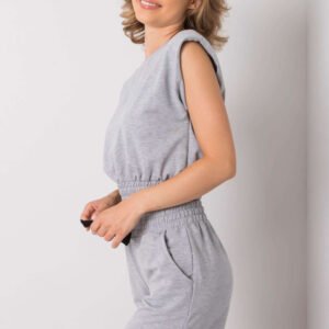 Komplet damski składający się z bluzy oraz szortów to idealna propozycja na co dzień i do sportowych stylizacji. Gładki, jednolity materiał nadaje całości minimalistyczny, nowoczesny charakter. Bluza o krótkim kroju z okrągłym dekoltem i wszytymi poduszkami na ramionach subtelnie podkreśla sylwetkę, dodając jej struktury. Brak rękawów zapewnia swobodę ruchów i komfort w cieplejsze dni. Szorty o prostym kroju i średnim (regularnym) stanie posiadają boczne, wsuwane kieszenie oraz praktyczne troczki w pasie, które umożliwiają indywidualne dopasowanie. Komplet wykonany z mieszanki bawełny, poliestru i elastanu łączy naturalną miękkość z elastycznością i trwałością materiału.