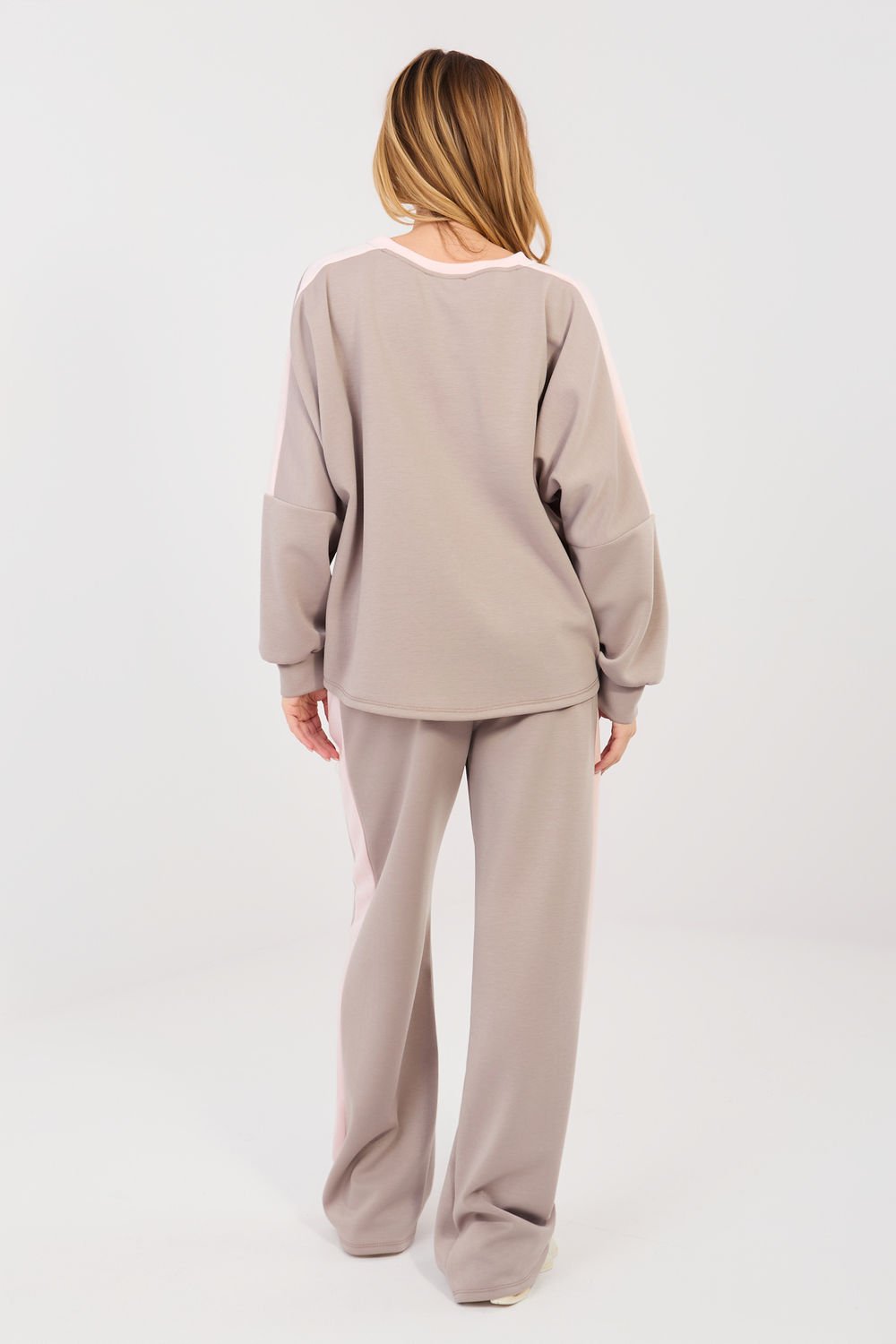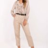 Damski komplet dresowy składający się z bluzy i spodni to wygodna i stylowa propozycja do codziennych stylizacji w casualowym wydaniu. Model doskonale sprawdzi się zarówno na co dzień, jak i podczas spacerów czy odpoczynku, łącząc modny wygląd z maksymalnym komfortem noszenia. Ozdobne napisy i cyfry umieszczone na przodzie bluzy oraz na rękawach nadają całości sportowego, nowoczesnego charakteru. Komplet wykonany jest z wysokiej jakości mieszanki poliestru, wiskozy i elastanu, co zapewnia miękkość, elastyczność oraz dobre dopasowanie do sylwetki. Bluza posiada długi rękaw oraz klasyczny, okrągły dekolt. Spodnie z długimi, szerokimi nogawkami i wysokim stanem gwarantują wygodę oraz swobodę ruchów. Praktyczne, boczne kieszenie wsuwane zwiększają funkcjonalność zestawu. Dodatkowym atutem są lampasy na nogawkach i rękawach, które podkreślają sportowy styl i optycznie wysmuklają sylwetkę.