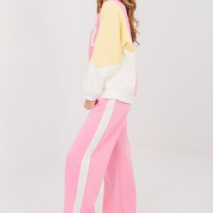 Wyjątkowo komfortowy komplet dresowy damski wykonany z materiału typu masełko niezwykle miękkiego, delikatnego i przyjemnego w dotyku. Tkanina będąca połączeniem poliestru, wiskozy i elastanu jest elastyczna, lekko lejąca i doskonale układa się na sylwetce, zapewniając maksymalną wygodę w codziennym użytkowaniu. Zestaw składa się z bluzy z długim rękawem oraz spodni z szerokimi, długimi nogawkami. Bluza o klasycznym, okrągłym dekolcie została ozdobiona efektownym napisem z dodatkiem cekinów, który nadaje całości modnego i kobiecego charakteru. Spodnie z wysokim stanem pięknie podkreślają talię i zapewniają komfort noszenia. W pasie znajdują się troczki do wiązania, umożliwiające idealne dopasowanie do sylwetki. Praktyczne boczne kieszenie wsuwane zwiększają funkcjonalność, a szerokie nogawki nadają stylizacji swobodnego, nowoczesnego wyglądu. To idealny komplet dla kobiet, które cenią połączenie wyjątkowej miękkości, wygody i modnych detali w codziennych stylizacjach.